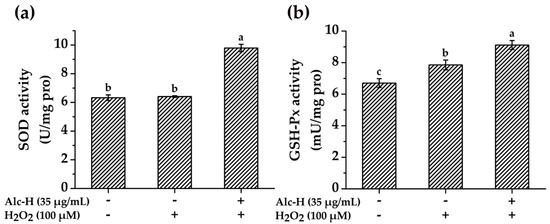 Effects of alcalase hydrolysate (Alc-H) on the activities of antioxidant enzymes in PC12 cells. (a) SOD activity; (b) GSH-Px activity. PC12 cells were pretreated with Alc-H (35 μg/mL) for 12 h before being exposed to 100 μM H2O2 for 1 h. Data are expressed as mean ± SD (n = 4). Bars with different alphabets indicate statistically significant difference between the means (p < 0.05).
