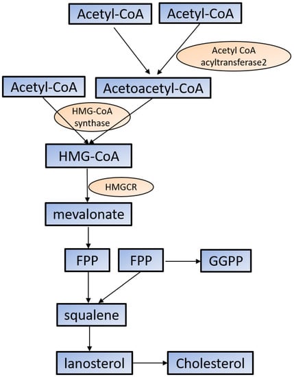 Cholesterol is required for not only membrane integrity and fluidity but also the production of hormones including steroids and vitamins [45,46]. Cholesterol biosynthesis begins with acetyl-CoA in the cytoplasm. Acetoacetyl-CoA is produced from two acetyl-CoA using acetyl-CoA acyltransferase 2 and then reacts with the third acetyl-CoA by the HMG-CoA synthase to produce 3-hydroxy-3-methylglutaryl-CoA (HMG-CoA). HMG-CoA reductase (HMGCR) reduces HMG-CoA to mevalonate, which is the primary rate-limiting step in cholesterol synthesis [45,46]. Mevalonate is converted to farnesyl pyrophosphate (FPP) by a series of enzymatic reactions, then two FPPs are condensed to squalene, which commits to sterol production. Most of squalene is converted to lanosterol, and through several additional enzymatic reactions, lanosterol is converted to cholesterol. FPP is also converted to geranylgeranyl pyrophosphate (GGPP); both FPP and GGPP modify oncogenic proteins, such as Ras, via enzymatic prenylation and activate them [45,46] (Figure 1).