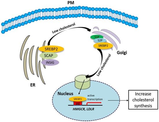 The synthesis of cholesterol is regulated by feedback control involving sterol regulatory element-binding protein 2 (SREBP2). SREBP is an ER membrane-bound protein, where it interacts with SREBP cleavage-activating protein (SCAP) [47]. When the sterol level at the ER is low, the conformation of SCAP is changed, allowing SREBP2 to translocate from the ER to the Golgi. At the Golgi, SREBP2 undergoes two sequential cleavages by site 1 protease (S1P) and site 2 protease (S2P), liberating the active soluble fragment of SREBP2 from the membrane. The processed SREBP2 enters the nucleus and increases expressions of many genes involving sterol biosynthetic pathway including HMGCR. Conversely the accumulation of cholesterol in the ER inactivates the SREBP2 pathway via insulin-induced genes (INSIGs). INSIGs interact with SCAP and promote the ER retention of SCAP, which blocks the ER-to-Golgi transportation of SREBP2 and reduces cholesterol biosynthesis [47] (Figure 2). In addition to SREBP2, liver X receptors (LXRs) [48,49] and nuclear factor erythroid 2 related factor-1 (NRF1) [50] are also involved in the regulation of cholesterol synthesis. High cholesterol levels activate LXRs, resulting in cholesterol synthesis inhibition [48,49].