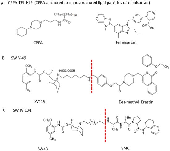 The structures of CPPA-TEL-NLP, SW V-49, and SW IV 134. (A) The structure of CPPA and Telmisartan: CPPA-TEL-NLP was prepared by anchoring CPPA to nanostructured lipid particles of Telmisartan. (B) The sigma-2 ligand SV119 was chemically conjugated to dm-Erastin, resulting in the sigma-2/dm-Erastin conjugate SW V-49. (C) SW IV 134 was constructed by sigma-2 ligand SW43 and small molecule SMAC mimetic compound (SMC). CPPA-TEL-NLP: 3-(4-cyclohexylpiperazine-1-yl) propyl amine (CPPA) anchored nanostructured lipid particles (NLP) of telmisartan (TEL).