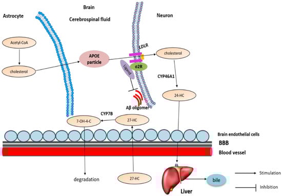 To date, the oxysterols including 24-HC and 27-HC are implicated in the pathogenesis of AD. In neurons, a brain-specific enzyme CYP46A1 converts excessive cholesterol into 24-HC, then it is exported out of the brain and carried by LDL to the liver for degradation, while another oxysterol, 27-HC, is produced by CYP27A1 in the periphery and moves into the brain by circulation. Then, 27-HC is converted into 7α-hydroxy-3-oxo-4-cholestenoic acid (7−OH-4-C) by the enzyme CYP7B, which then diffuses out of the brain through the BBB and moves into the periphery for degradation [109] (Figure 5).