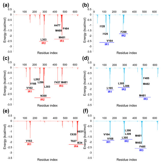 The per-residue energy decomposition of the complexes of PYT108 (a,b) and PYT103 (c,d) and PYT67 (e,f) for hCav1.3 (a,c,e) and hCav1.2 (b,d,f). The main interaction regions (IR) are marked under the corresponding residues.