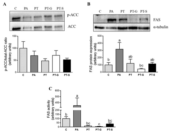 p-ACC/total-ACC ratio (index of ACC activity) (A), protein expression of FAS (B), and FAS activity (C) in AML12 hepatocytes incubated with 0.3 M palmitic acid (PA), with or without pterostilbene (PT) or its metabolites (PT-G and PT-S), for 18 h. The Western blot bands shown are representative of 6 samples/group. FAS protein expression was normalized by α-tubulin. Data are means ± SEM. Values not sharing a common letter (a, b and c) are significantly different (p < 0.05). In FAS protein expression: C (control group) vs. PA, p = 0.045; PA vs. PT-G, p = 0.022. In FAS activity: C vs. PA, p = 0.04; C vs. PT-G, p = 0.029; PA vs. PT; p = 0.003; PA vs. PT-G, p = 0.001; PA vs. PT-S, p = 0.039. ACC: Acetyl-CoA carboxylase; FAS; fatty acid synthase.