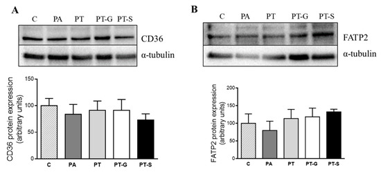 With regard to fatty acid uptake across the plasma membrane, CD36 and FATP2 proteins were analyzed. After 18 h of treatment, no significant changes in these fatty acid transporters were induced by PA. In hepatocytes co-treated with pterostilbene or its metabolites, protein expression of CD36 and FATP2 remained unchanged (Figure 4A,B).