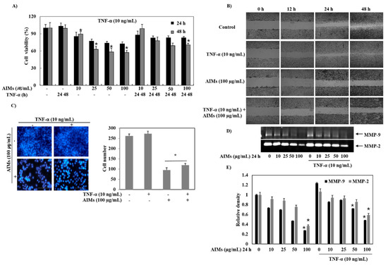 Cancer cell invasion is the key event in metastasis. Here, in this study, AIMs inhibited cell invasion in vitro, which was measured by Matrigel invasion assays (Figure 1C). TNF-α was used to stimulate cells in order to check the cancer cell invasion. It was observed that TNF stimulated the invasion of Hep3B cells and that AIMs inhibited the TNF effect on the cell invasion. We also performed a wound healing assay to check the inhibitory activity on cancer cell migration with TNF-α treatment to know its stimulation effect on the cancer cell migration of Hep3B cells. It was found that TNF-α stimulated the migration of Hep3B cells and that AIMs inhibited TNF-α-stimulated cell migration in the wound healing test at a concentration of 100 μg/mL (Figure 1D). Metastasis is one of the major events in cancer cell invasion. Here, in this study, Matrigel invasion assays showed that AIMs inhibit cell invasion in in vitro (Figure 1C).