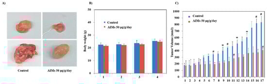 The effect of AIMs on body weight and the tumor. The AIMs were administered to mice at 50 μg/g/day. (A) The representative figures are for the largest and smallest tumors. The size of the tumors is highly reduced by the treatment of AIMs. (B) The body weight is measured every week until the fourth week. The body weight of mice did not alter with the treatment of AIMs. This shows that the AIMs treatment shows no clinical signs of toxicity and no change in body weight. (C) The volume of the tumor was significantly reduced with the treatment of AIMs. The data are shown as the means ± SD of three independent experiments. * p < 0.05 between the treated and the untreated control group. # p < 0.01 between the treated and the untreated control group.