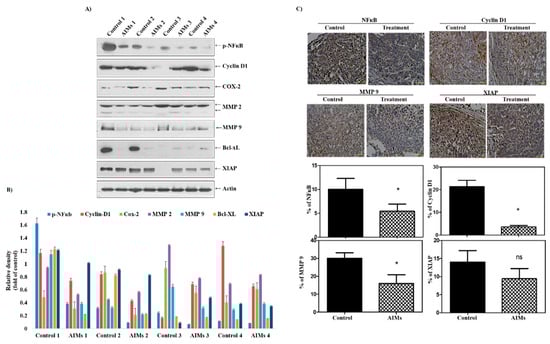 Reduction in NF-κB activation with the treatment of AIMs. (A) The NF-κB activation has been reduced with the treatment of AIMs. Western blot analysis of the tumor xenograft models using antibodies against NF-κB and various NF-κB-regulated proteins involved in cancer cell proliferation (cyclin D1 and COX-2), invasion, and migration (MMP-2 and MMP-9) and anti-apoptosis (Bcl-xL). (B) Densitometry analysis of Western blot bands. The values were normalized against β-actin. (C) The immunohistochemical analysis of NF-κB, proliferation (cyclin D1), and invasion (MMP-9) revealed that AIMs suppressed the nuclear activity of NF-κB and the expression of proliferation and invasion. The data are shown as the means ± SD of three independent experiments, * p < 0.05 between the treated and the untreated control group.