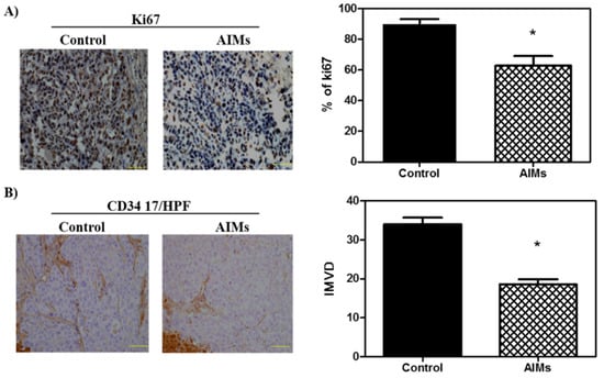 AIMs inhibits Ki67 expression and intra-tumoral microvessel density (IMVD) in Hep3B cell-originated tumors in athymic nude mice. (A) Cell proliferation was demonstrated by Ki67 immunostaining. Reduction in Ki67 staining showed that AIM treatment reduces cell proliferation. (B) AIM assists in the decrease in angiogenesis which is shown by the CD34 staining. The decrease in the expression of CD34 shows the suppression of angiogenesis. The data are shown as the means ± SD of three independent experiments, * p < 0.05 between the treated and the untreated control group.