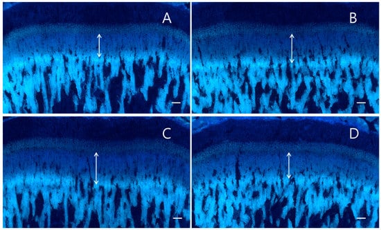 Fluorescence photomicrograph of a longitudinal section of the proximal tibia. The fluorescent line corresponds to the tetracycline hydrochloride (20 mg/kg) injection. The arrow indicates the length of growth. (A) Control (distilled water) group, (B) recombinant human growth hormone (20 μg/kg, s.c.) group, (C) A. macrostemon 100 mg/kg group, (D) A. macrostemon 300 mg/kg group. Scale bar = 200 μm.