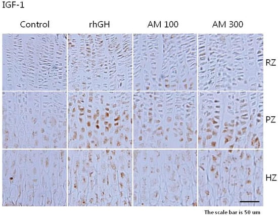 Immunohistochemical localization of insulin-like growth factor-1 in the growth plate. Control: distilled water (10 mL/kg, p.o.) group; rhGH: recombinant human growth hormone (20 μg/kg, s.c.) group; AM 100: A. macrostemon (100 mg/kg, p.o.) group; AM 300: A. macrostemon (300 mg/kg, p.o.) group. RZ: resting zone; PZ: proliferative zone; HZ: hypertrophic zone. Scale bar = 50 μm.