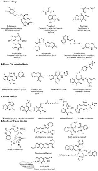 Quinolone and its structural congeners are versatile chemical entities that are ubiquitously present as core structures of pharmaceuticals, agrochemicals, and functional organic materials. Since the first identification of quinine from Cinchona bark in 1811, the isomeric compounds 2(1H)-quinolone and 4(1H)-quinolone have become representative twin molecules of pharmaceutical interest. In the pharmaceutical market, 4-quinolone drugs have attracted great attention since the discovery of nalidixic acid in 1962 []. Generations of several blockbuster fluoroquinolone antibiotics have been successfully commercialized. Moreover, 2-quinolones are a significant topic in the research area of medicinal chemistry as well. To date, six compounds in this class have been marketed (Figure 1A). For example, Indacaterol, Procaterol, and Repirinast are used for the treatment of respiratory diseases. Rebamipide is an antiulcer agent and Cilostamide is an antihelminthic drug. Brexipiprazole is a successor of the top-selling generic antipsychotic agent, Aripiprazole. Targets on this scaffold, β-adrenergic receptors [,,,], muscarinic acetylcholine receptors [,,], vascular endothelial growth factor receptors [,], poly [ADP-ribose] polymerase-1 [,,,,], tyrosine-protein kinases [], and serine/threonine-protein kinases [,,], have been extensively studied for decades. In addition to such target investigations, new lead compounds disclosed in recent reports [,,,,] imply further potential pharmaceutical utility of the skeleton (Figure 1B).