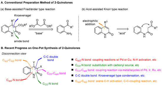 The development of synthetic methodologies for 2-quinolones has a long history. Conventional approaches represent two types of reaction: Friedänder-type reaction and Knorr-type reaction (Figure 3A). Holding high practicality and scalability for setting a good platform for further functionalization, the two methods have been used in a complementary fashion. The Friedänder-type reaction is the base-assisted intermolecular reaction between 2-aminoacylarenes and dialkyl malonates [,]. Considering bond disconnections, it needs a C–C double bond formation via Knoevenagel reaction and a C–N amide bond formation via nucleophilic substitution of amines to the esters. In the acid-assisted Knorr-type reaction [,,,,,,], electrophilic aromatic substitution followed by dehydration forms Csp2–Csp2 bonds. While the two methods have inspired the development of numerous procedures based on the same bond disconnection, recent studies show remarkable advances in the synthesis of this small molecule by varying strategies that originate from new standpoints of bond disconnections (Figure 3B).