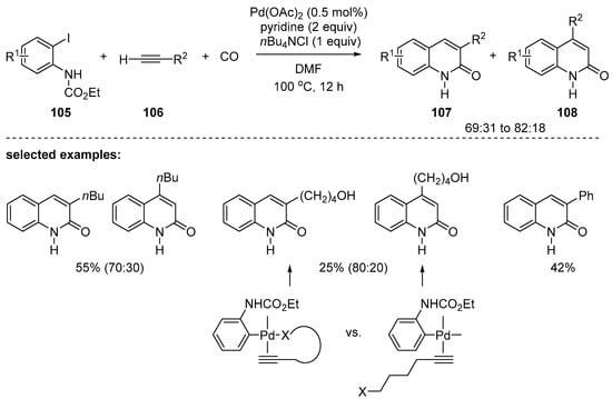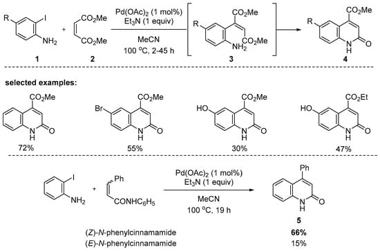 o-Iodoanilines have been largely exploited to access to 2-quinolone derivatives. Moreover, 4-Carbomethoxy-2-quinolones 4 could be efficiently synthesized from a dimethyl maleate and readily available 2-iodoanilines via the formation of (Z)-acrylic esters 3 in 30–72% yields (Scheme 1). The key intermediates 3 are formed by the Heck reaction. Moreover, 4-Phenyl-2-quinolone 5 could be also synthesized from 2-iodoaniline with (Z)-N-phenylcinnamamide in a 66% yield, whereas only in a 15% yield with the E-isomer. This indicates that (Z)-isomers are more suitable substrates for π-complexation with arylpalladium species than (E)-isomers [].