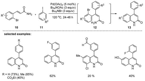 Synthesis of 4-aryl-2-quinolones through a sequential Heck reaction/amination process of β-(2-bromoaryl) acrylamides 10 with aryl iodides 11.