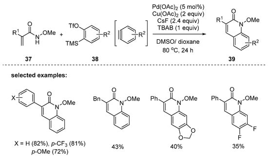 In 2015, Xu and coworkers disclosed a new methodology for the construction of N-methoxy 2-quinolones 39 by palladium-catalyzed N–H activation/Heck reaction []. The reaction coupled acryl amides 37 to arynes 38, which was enabled by a catalytic Pd(OAc)2 and hyperstoichiometric use of Cu(OAc)2 and CsF in mixed solvents of dioxane and DMSO at 80 °C (Scheme 9). The acrylamides with electron-rich or -deficient aryl substituents at the α-position afforded 39 in good yields. However, the reactions using cinnamides or cryotonyl amides instead of acryl amides were not successful, thus indicating the importance of strain release. The control experiments and KIE (kinetic isotope effect) measurement showed that aminopalladation of 37 to benzyne is the key step of the catalytic cycle.