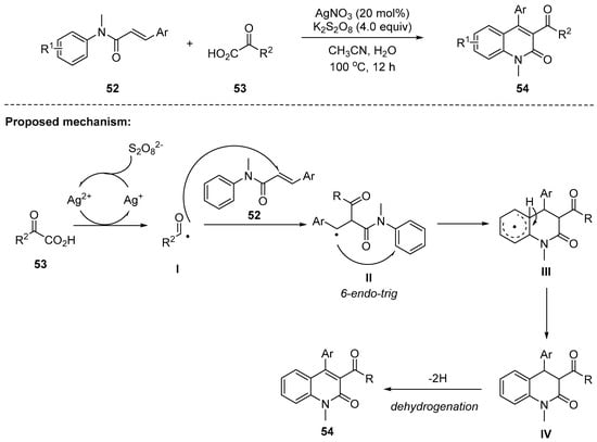 Mai and coworkers have achieved the practical synthesis of 3-acyl-4-aryl-2-quinolones 54 using AgNO3 and K2S2O8 as a radical generator []. The reaction with higher loading (4 equiv) of oxidant K2S2O8 was better than that with lower loading (1.0–2.5 equiv) and the product was obtained in an 83% yield. A wide range of both electron-withdrawing and -donating substituents such as o-Cl, p-Br, p-OMe, and 3, 4-diOMe on the phenyl ring of cinnamic acid 52 were compatible. In addition, 2-oxo-2-phenyl acetic acids 53 containing electron-withdrawing and -donating groups proceeded smoothly to produce 54 in good yields. The proposed reaction mechanism of this radical tandem cyclization involves acyl radical trapping, generated from carboxylate 53, by the α-position of the N-methyl-N-phenyl cinnamamides 52 followed by intramolecular cyclization to give an intermediate III. The aromatizative dehydrogenation likely results in the formation of the final products 54 (Scheme 14).