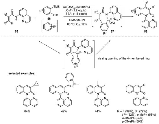 Duane and Zhang reported copper-mediated one-pot cascade cyclization of acrylamides and arynes. A catalytic system of Cu(OAc)2 and O2 in DMA/MeCN was discovered for the efficient preparation of 4-aryl-2-quinolones 58. It is notable that Cu(OAc)2 showed higher reactivity than Pd(OAc)2 []. A wide range of substituents on the α-position of monosubstituted acrylamides, e.g., aryl, alkyl, and cycloalkyl, were well tolerated to provide to 3-disubstituted 2-quinolones. However, only 39% yield was obtained with α-fluorinated acrylamide. In addition, α,β-disubstituted acrylamides could be utilized to generate 3,4-disubstituted 2-quinolinones in moderate yields. Through some control experiments, including an intermolecular KIE (value = 5.1) and radical trapping experiment, the single-electron transfer (SET) mechanism could be excluded. On the basis of experimental and computational studies, a plausible mechanism was proposed. The organometallic alkenyl C–H bond activation/addition to arynes via a Cu(III) intermediate 57, presumably through the ring opening of the four-membered ring I, affords the expected products 58 with a new C–N bond after reductive elimination (Scheme 15).