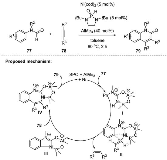 Recently, Ye and coworkers reported a new route to 2-quinolones using arylformamides 77 and alkynes 78 via a Ni–Al cooperative bimetallic catalysis. This novel strategy features nonchelated dual C–H activation, discovery of a novel secondary phosphine oxide (SPO) ligand in bimetallic catalysis, wide substrate scope, and good functional group tolerance []. The regioselectivity was highly dependent on substituents of alkynes. For example, the reaction of asymmetric dialkyl acetylenes resulted in poor regioselectivities, while the use of alkylphenyl acetylenes led to good regioselectivities (>10:1). It is suggested that the regioselectivity is determined by the electronic factors of the substituents at both sides of alkynes. In cases using alkylphenyl acetylenes, the phenyl was proximate to the carbonyl groups. This is due to favoring a more stable benzylic nickel species during the second alkylphenyl alkyne insertion to the nickelacycle III. The control experiments indicated that the SPO played the role of a bifunctional ligand to facilitate the reaction by the unique coordination mode, as shown in proposed mechanism in Scheme 22. A plausible mechanism for this process involves formation of the intermediate I via oxidative addition of Ni(0) to the formyl C–H bond. This step is proposed to be likely assisted by the SPO-bound Ni–Al complex, which is followed by Ni–H addition across the alkynes 75. Next, the aryl C–H bond cleavage forms the nickelacycle III. The subsequent alkyne insertion and reductive elimination affords 76.