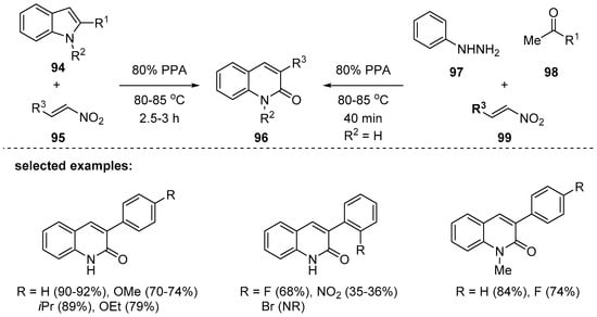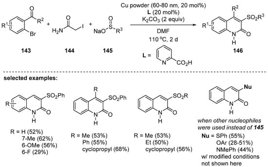 Although many mechanistically distinct methods via two-component reactions are described above, they require the use of expensive noble metals, often with expensive ligands, and external oxidants when needed to re-initiate the catalytic cycle. Meanwhile, the transition-metal-free approaches to functionalized 2-quinolones via two-component reaction have been widely studied. Some representative examples are presented in this section.