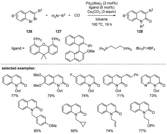 - Tadd, A.C.; Matsuno, A.; Fielding, M.R.; Willis, M.C. Cascade palladium-catalyzed alkenyl aminocarbonylation/intramolecular aryl amidation: An annulative synthesis of 2-quinolones. Org. Lett. 2009, 11, 583–586. [Google Scholar] [CrossRef] [PubMed]