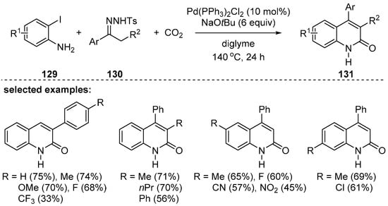 - Sun, S.; Hu, W.-M.; Gu, N.; Cheng, J. Palladium-catalyzed multi-component reactions of N-tosylhydrazones, 2-iodoanilines and CO2 towards 4-aryl-2-quinolinones. Chem. Eur. J. 2016, 22, 18729–18732. [Google Scholar] [CrossRef] [PubMed]