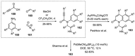 - Du, X.; Huang, J.; Nechaev, A.A.; Yao, R.; Gong, J.; Eycken, E.V.V.; Pereshivko, O.P.; Peshkov, V.A. Gold-catalyzed post-Ugi alkyne hydroarylation for the synthesis of 2-quinolones. Beilstein J. Org. Chem. 2018, 14, 2572–2579. [Google Scholar] [CrossRef]
