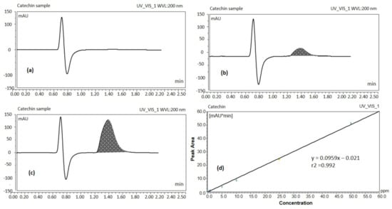 UHPLC chromatograms of blank sample (a), catechin standard solution 5 ppm (b), catechin of the real sample (green tea leaf extract solution) (c), UHPLC calibration curve of catechin (d) (UV detection at 200 nm).