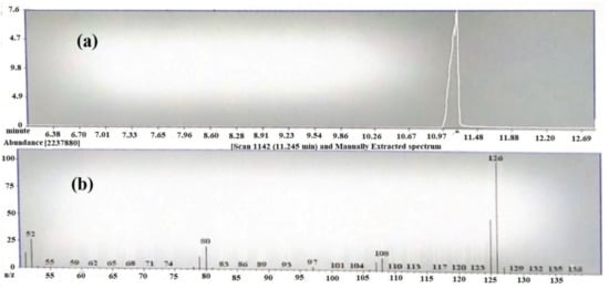 (a) TIC chromatogram of epigallocatechin-3-gallate (EGCG) by GC-MS and (b) mass spectrum of 1,2,3-benzenetriol.