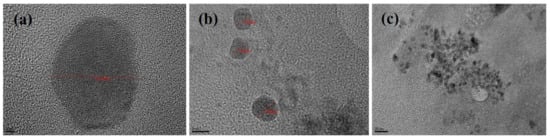 TEM micrographs of green tea extract-loaded nanophytosomes (batch 15) scales showing (a) 2 nm, (b) 5 nm and (c) 20 nm range.