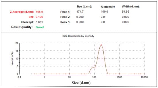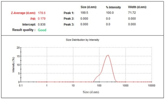 The physical stability of prepared green tea extract-loaded nanophytosome was observed after one month at ambient conditions (25 ± 1 °C and 65 ± 5% RH). The results (Table 1) show that batch 16 with the highest drug loading (86.68%) has an average particle size of 173 ± 4 nm, which after one month exhibits an average particle size of 178 ± 6 nm (Figure 11) and drug loading of 84.07%. No significant changes in average particle size and drug loading were observed for the phytosomal preparation stored at 25 °C and 65% RH.