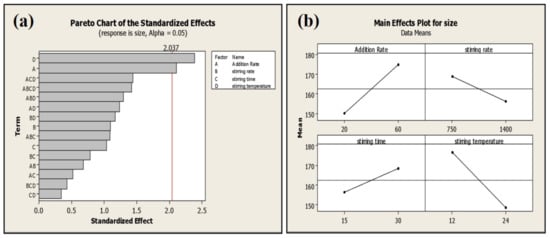 Pareto (a) and main effect plot (b) of process parameters (PP) on average particle size.