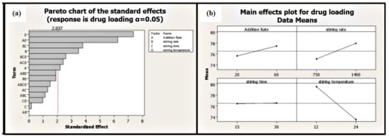 Pareto (a) and main effect plot (b) of process parameters (PP) on drug loading efficiency.