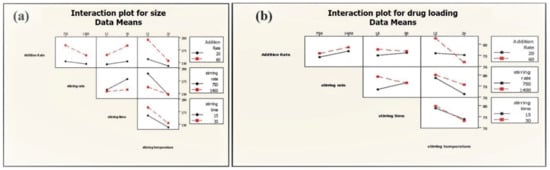 Two-way interactions between process parameters were not significant for the average particle size of phytosome, which was, however, found to have a significant impact on the drug loading of phytosome (addition rate: Stirring temperature; stirring speed: Stirring time) (Figure 8). Slow addition rate and low stirring temperature lead to high drug loading (86.68%) at high stirring speed (Table 2).