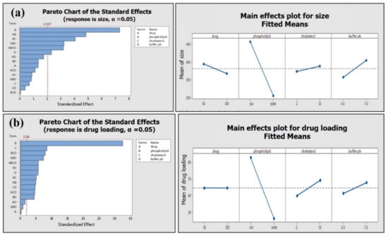Pareto chart and main effect plot of material attributes (MA) on (a) average phytosome size and (b) drug loading efficiency.