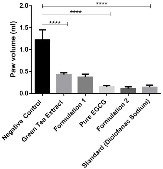 Green tea extract, pure EGCG and its phytosomal preparations exhibited significant anti-inflammatory activity (p ≤ 0.001) against acute edema when compared to that of the negative control group (Figure 12 and Table 3). It was observed that the phytosomal preparation of pure EGCG showed the highest reduction in carrageenan-induced paw edema (Table 3), significantly higher (p ≤ 0.001) compared to the negative control group and higher than other groups used during the anti-inflammatory study.