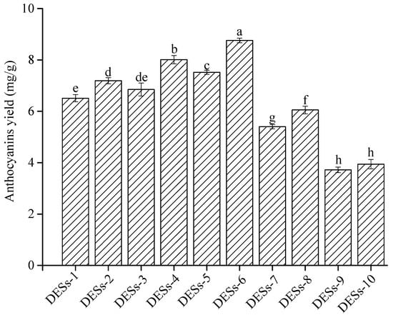 Effect of different deep eutectic solvents (DESs) on the yield of anthocyanins from blueberry wine residues. Note: Different lowercase letters indicate significant differences between groups, p < 0.05.