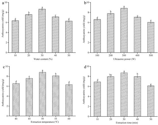 The effects of different extraction variables on the anthocyanins yield from blueberry wine residues using DESs-6 as a eutectic solvent: (a) water content, (b) ultrasonic power, (c) extraction temperature, (d) extraction time. Note: different letters indicate significant difference (p < 0.05, the same below).