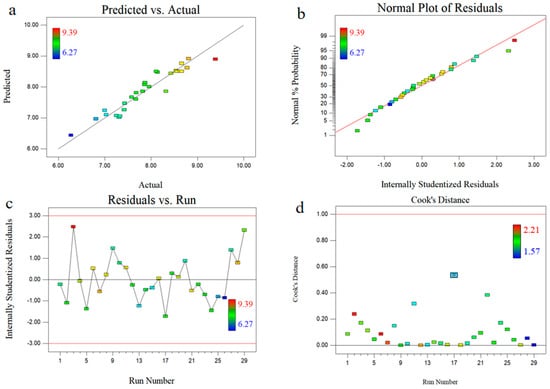 Figure 3a shows that the predicted values were consistent with the actual values, indicating that the predicted values could reasonably explain the experimental values. As shown in Figure 3b, these values also followed the normal distribution and had no deviation from the variance. In addition, the plots of the residuals and all data points were within ±3 (Figure 3c). Figure 3d shows the Cook’s distances of the simplified polynomial model. Cook’s distances were less than the limit of 1.0 so that there were no outliers in the given dataset.