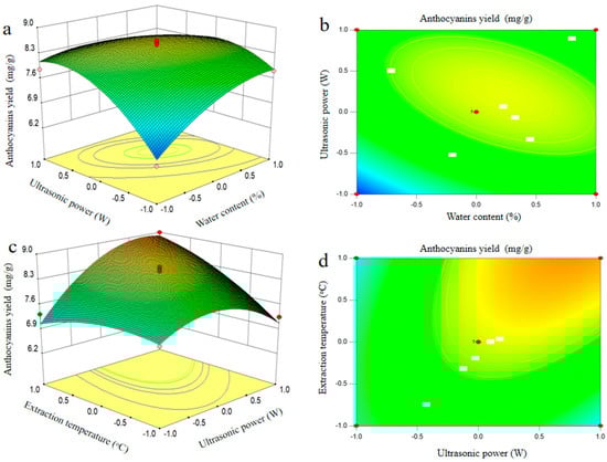 Three-dimensional response surface plots and corresponding contour plots. Influence of water content and ultrasonic power (a,b), ultrasonic power and extraction temperature (c,d) on anthocyanins yield from blueberry wine residues.