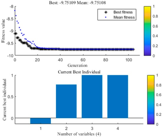 GA is employed to achieve a global solution for the multiple regression model based on RSM. The GA toolbox of the MATLAB version R2018b was employed in optimization studies. The running results of the GA M file are shown in Figure 5. The optimum extraction parameters to achieve the highest yield of anthocyanins (9.75 mg/g) from blueberry wine residues by using the UADESE were obtained at water content of 28.63%, ultrasonic power of 378 W, extraction temperature of 55 °C, and extraction time of 40 min. Figure 5 described the best fitness value and level for each factor. The negative sign on the optimal fitness graph was due to the negative sign in the multiple regression model before running the GA. The best individual plot indicated the extraction time as the best individual. A confirmatory experiment was performed to verify the reliability of the GA. According to the actual situation, the above process parameters were modified as follows: water content of 29%, ultrasonic power of 380 W, extraction temperature of 55 °C and extraction time of 40 min. Under this condition, the experimental value of anthocyanins yield was (9.32 ± 0.08 mg/g). Results indicated that the experimental and the predicted values were in accordance with a 95% confidence interval. Thus, GA coupled with RSM was successfully used to optimize the extraction conditions for the UADESE anthocyanins from blueberry wine residues.