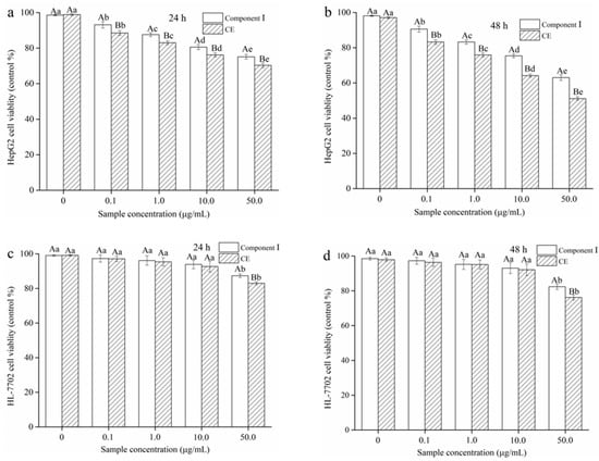 Effect of different concentrations of crude extract (CE) and component Ⅰ on the cell viability of HepG2 cells at (a) 24 h and (b) 48 h and HL-7702 cells at (c) 24 h, (d) 48 h. Note: Different lowercase letters indicate significant differences among different sample concentrations (p < 0.05), and different capital letters indicate that there are significant differences among different samples of the same concentration (p < 0.05).