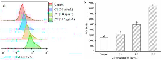 In accordance with the results of MTT, CE was selected for subsequent experiments. The effect of CE on ROS generation in HepG2 cells was monitored by the ROS kit in accordance with its instructions. In short, HepG2 cells (1 × 105 cells/mL) were seeded into 6-well plates and incubated overnight. Cells were treated with different concentrations of CE (0, 0.1, 1.0, 10.0 μg/mL) for 48 h. Cells were then washed with PBS and subsequently incubated with 5 μM DCFH-DA in PBS at 37 °C for 30 min. HepG2 cells were washed with PBS, and collected by centrifugation, and re-suspended in PBS. Finally, the ZE5 multicolor flow cytometer (American Bio-rad Company, Hercules, CA, USA) was used to determine the fluorescence intensity.