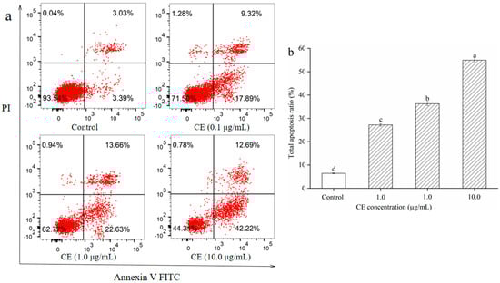 The Annexin V/PI double staining and the flow cytometry analysis were carried out to elucidate the effect of CE on the apoptosis of HepG2 cells. As shown in Figure 8, the percentage of apoptotic HepG2 cells in the control group was 6.42% ± 0.18% of the total cells. After exposure to 0.1, 1.0, and 10.0 μg/mL CE for 48 h, the percentages of apoptosis were 27.21% ± 0.53%, 36.29% ± 0.81%, and 54.91% ± 1.12%, respectively. Compared with that of the control group, the apoptosis rate of cells treated with 0.1, 1.0, and 10.0 μg/mL CE increased by 20.97%, 30.05%, and 48.67%, respectively. Results suggested that the CE had antitumor activity by promoting cell apoptosis. These experimental results were in good agreement with Long et al.’s (2018) results [32]. The mechanism might be that CE could accelerate the apoptosis of cancer cells by up-regulating the expression levels of apoptosis-related proteins and down-regulating the apoptotic inhibitory factors [33].
