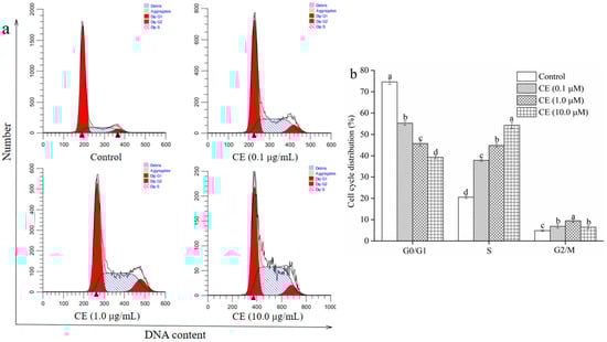 The effect of different concentrations of CE on the cell cycle distribution was analyzed using the commercial cell cycle detection kit to clarify whether the growth inhibition of CE on HepG2 cells was related to cell cycle arrest. As shown in Figure 9b, the percentage of HepG2 cells in the G0/G1 phases was dramatically reduced when cells were exposed to CE (0.1–10.0 μg/mL) for 48 h (p < 0.05). The CE treatment (0.1–10.0 μg/mL) notably enhanced the percentage of cells in the S phases in a dose-dependent manner compared with the vehicle-control treatment (p < 0.05). Compared with the vehicle treated group, 0.1–10.0 μg/mL CE treatment significantly increased the percentage of cells in the G2/M phases (p < 0.05). Nevertheless, no remarkable difference in the percentage of cells in the G2/M phases was observed between the 0.1 μg/mL and the 10.0 μg/mL CE treated groups (p > 0.05). These results revealed that CE could arrest the HepG2 cells in the S phases.