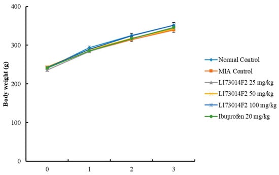 Effects of LI73014F2 on changes in body weight in monosodium iodoacetate (MIA)-induced osteoarthritis in rats. Body weight was evaluated once a week for 3 weeks and data are presented as mean ± SEM (n = 8/group). No significant difference was detected between all the groups.