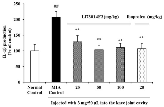 Effects of LI73014F2 on synovial fluid levels of inflammatory factors in MIA-induced osteoarthritis in rats. The collected synovial fluid was analyzed for the levels of IL-1β using commercial ELISA kits. Data are expressed as mean ± SEM (n = 8/group). ** p < 0.01, compared to the MIA-induced control group; ## p < 0.01, compared to the non-MIA-induced control group.