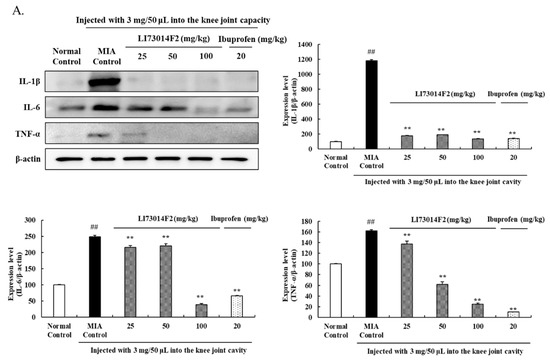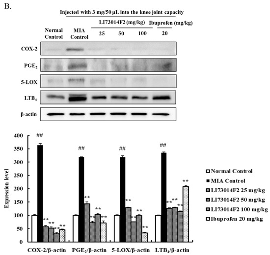 As shown in Figure 3B, COX-2 protein levels were significantly lower in the groups treated with LI73014F2 (p < 0.01) and ibuprofen (p < 0.01). Treatment with 25, 50, and 100 mg/kg LI73014F2 lowered the PGE2 expression by 55%, 77%, and 68%, respectively (p < 0.01 for all conditions), whereas ibuprofen decreased the PGE2 expression by 77% (p < 0.01). When compared to the MIA-induced group, the 5-LOX expression level dose-dependently reduced by 60%, 78%, and 69% upon treatment with 25, 50, and 100 mg/kg LI73014F2, respectively (p < 0.01 for all conditions), while ibuprofen treatment significantly reduced (p < 0.01) the 5-LOX expression by 90%. In addition, LTB4 expression in the 25, 50, and 100 mg/kg LI73014F2-treated groups significantly reduced (p < 0.01 for all conditions) by 63%, 61%, and 66%, respectively, while ibuprofen administration reduced the LTB4 expression by 38% (p < 0.01).