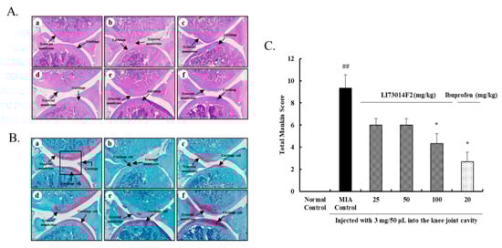 Effects of LI73014F2 on the histological evaluation of joint activity in MIA-induced osteoarthritis in rats. (A) Cartilage and synovial membrane in knee joints were stained with hematoxylin and eosin (H&E), (B) cartilage cell and proteoglycan layer in knee joints stained with Safranin O, and (C) graded on a 0–13 scale using the Mankin scoring system. (a) Normal Control group, (b) MIA Control group, (c) MIA + LI73014F2 25 mg/kg, (d) MIA + LI73014F2 50 mg/kg, (e) MIA + LI73014F2 100 mg/kg, and (f) MIA + ibuprofen 20 mg/kg. Data are expressed as mean ± SEM (n = 5/group). * p < 0.05, compared to the MIA-induced control group; ## p < 0.01, compared to the non-MIA-induced control group.
