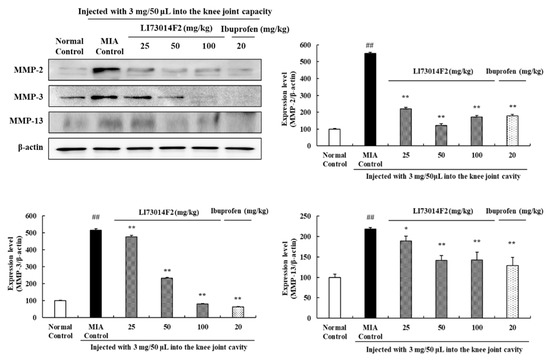 The protein levels of MMP-2, MMP-3, and MMP-13 were evaluated to investigate the effect of LI73014F2 on MMPs in the cartilage tissues of OA-induced rats. As shown in Figure 5, MIA injection significantly enhanced MMP-2, MMP-3, and MMP-13 expression in comparison with the normal control group. Treatment with 25, 50, and 100 mg/kg LI73014F2 and ibuprofen significantly reduced (p < 0.01 for all conditions) MMP-2 levels, compared to those in the MIA-treated group. In addition, there was a dose-dependent decrease in the levels of MMP-3 upon administration of 25 mg/kg (by 7%) and 50 mg/kg (by 54%) LI73014F2, as compared to the MIA-treated group. Moreover, treatment with 100 mg/kg (by 84%) LI73014F2 and ibuprofen (by 87%) also significantly inhibited the MMP-3 expression. Moreover, the OA-induced increase in the expression levels of MMP-13 was significantly decreased upon administration of 50 mg/kg (by 35%) and 100 mg/kg (by 34%) LI73014F2, as well as of ibuprofen (by 40%).