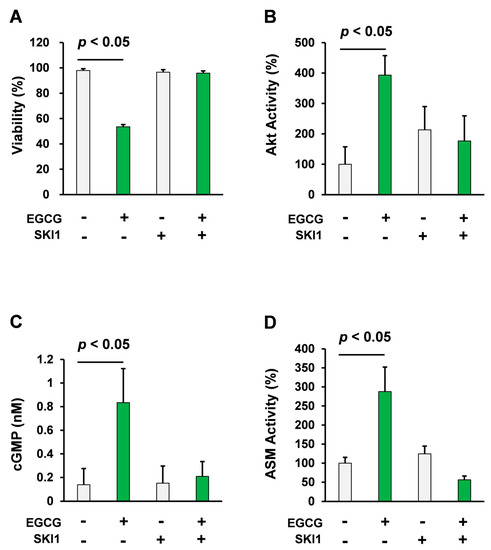 Pharmacological inhibition of Src attenuated the cell death inducing effect of EGCG. (A) U266 human multiple myeloma cells were treated with EGCG (10 μM) and SKI1 (2.5 μM, from 1 h before EGCG treatment) for 72 h. Cell viability was measured using the trypan blue method (n = 4). (B) U266 human multiple myeloma cells were treated with EGCG (10 μM) and SKI1 (2.5 μM; from 1 h before EGCG treatment) for 1 h. Akt activity was evaluated using the K-LISA kit (n = 4). (C) U266 human multiple myeloma cells were treated with EGCG (10 μM) and SKI1 (2.5 μM; from 1 h before EGCG treatment) for 3 h. cGMP levels were evaluated using competitive immunoassay (n = 4). (D) U266 human multiple myeloma cells were treated with EGCG (10 μM) and SKI1 (2.5 μM; from 1 h before EGCG treatment) for 3 h and ASM activity was evaluated (n = 3).
